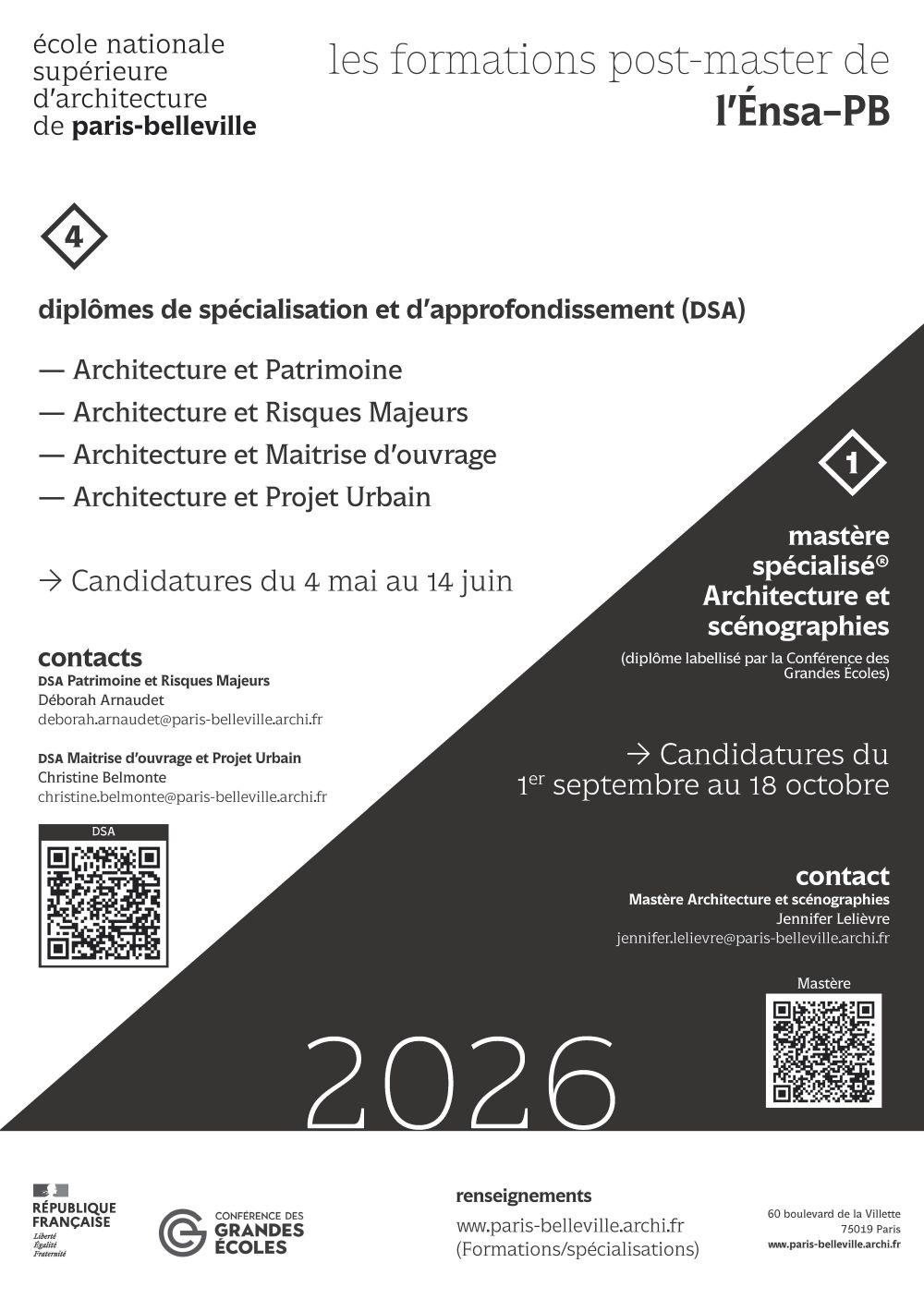 4 diplômes de spécialisations au choix : patrimoine, projet urbain, risques majeurs et maîtrise d'ouvrage.
