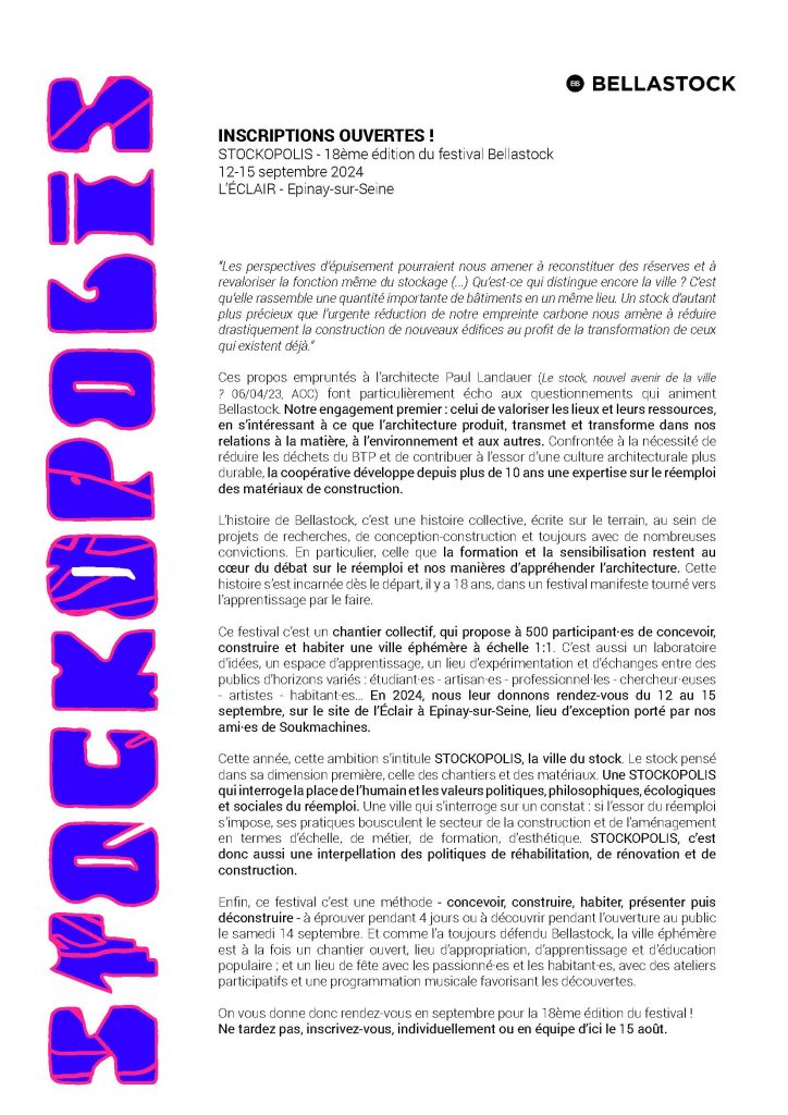 Bellastock, engagée dans la transition écologique et sociale appliquée aux secteurs de l’architecture, de la construction et de l’aménagement, revient avec son festival annuel du 12 au 15 septembre 2024: STOCKOPOLIS. L’événement qui aura lieu à Epinay sur Seine vous propose d’imaginer, de construire, d’habiter et de faire vivre une ville éphémère pendant 4 jours, en venant expérimenter la pratique du réemploi en architecture.