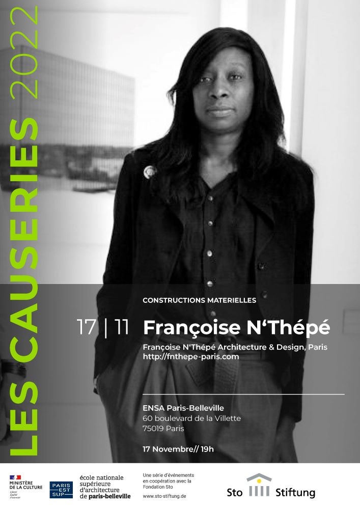 Françoise N’Thépé est née à Douala (Cameroun). Elle vit et habite à Paris depuis 1975, et exerce le métier d’architecte depuis 20 ans. Diplômée de l’école Spéciale d’Architecture (Paris) en 1999, elle collabore avec l’architecte Aldric Beckmann avec qui elle fonde quelques temps plus tard l’agence Beckmann-N’Thépé Architectes.
