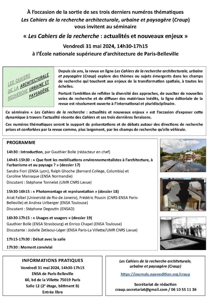 Depuis six ans, la revue en ligne Les Cahiers de la recherche architecturale, urbaine et paysagère (Craup) explore des thèmes ou sujets émergents dans les champs de recherche qui touchent aux enjeux de la transformation spatiale, à toutes les échelles, portant l’ambition de refléter la diversité des approches, de susciter de nouvelles voies de recherche et de diffuser des matériaux inédits. Ce séminaire « Les Cahiers de la recherche : actualités et nouveaux enjeux » est l’occasion d’exposer cette dynamique à travers l’actualité récente de la revue et ses trois dernières livraisons. Les trois derniers dossiers thématiques seront le support de présentations et de débats autour des directions de recherche prises et confortées par la revue et plus largement par les champs de recherche qu’elle véhicule.
