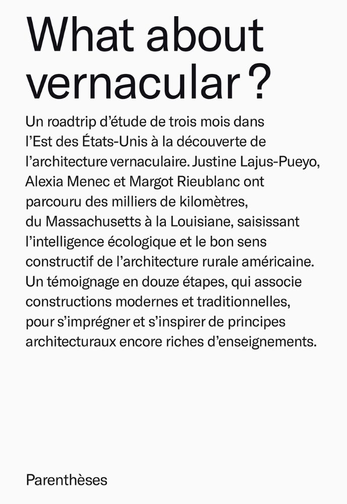 Un road-trip de trois mois dans l’Est des Etats-Unis à la découverte de l’architecture vernaculaire. Justine Lajus-Pueyo, Alexia Menec er Margot Rieublanc ont parcouru des milliers de kilomètres, du Massachusetts à la Louisiane, saisissant l’intelligence écologique et le bon sens constructif de l’architecture rurale américaine. Un témoignage en douze étapes, qui associe constructions modernes et traditionnelles, pour s’imprégner et s’inspirer de principes architecturaux encore riches d’enseignements.